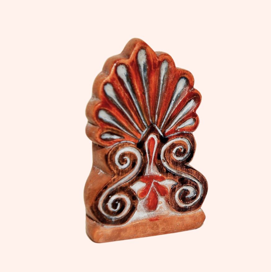 Ακροκέραμο με παράσταση τύπου ανθεμίου: Το ανθέμιον, το λουλούδι στην αρχαία Ελληνική γλώσσα, είναι ένα σχηματισμένο άνθος που χρησιμοποιείται ως διακοσμητικό θέμα. Πρόκειται για κλασική διακόσμηση που χρησιμοποιεί τα φύλλα της αμπέλου ή άλλων φυτών και χρησιμοποιείται σε ζωοφόρους ή ως στοιχείο διακοσμητικής απόκρυψης ατελειών στις άκρες μίας στέγης, ή σε σημεία ένωσης οικοδομικών στοιχείων. Ο φοίνικας και η άμπελος αποτελούσαν ιδιαίτερα φυτικά σύμβολα με μεγάλη θρησκευτική και λατρευτική σημασία για τους αρχαίους Έλληνες, αποτελώντας διαχρονικά σύμβολα του Ελληνισμού, καθώς ήταν συνδεδεμένα με τη λατρεία των Θεών (άμπελος-Διονύσιος) και χρησιμοποιούνταν στις βραβεύσεις των νικητών των αγώνων. Παράλληλα, λειτουργούσαν ως αποτρόπαια των κακών πνευμάτων, ώστε να στεριώσει η νέα οικία με καλοτυχία.